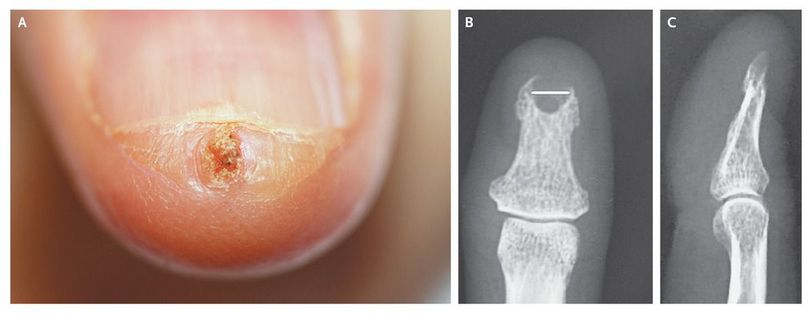 A 40-year-old woman presented with a 3-month history of a painful subungual mass of the left thumb. Examination revealed a tender, keratotic, subungual nodule (Panel A). Radiography of the digit showed a well-defined, cup-shaped erosion of the distal phalanx corresponding to the overlying subungual nodule (Panels B and C; the scale bar in the lesion in Panel B indicates 5 mm). There was no periosteal reaction. A wide excision was performed. Histologic examination showed the appearance of subungual keratoacanthoma. Solitary distal digital keratoacanthoma is a rare, usually painful, and destructive variant of keratoacanthoma. It may be locally aggressive, appearing as a crescent-shaped soft-tissue mass with an osteolytic defect of the underlying bone. Histologic features are usually indistinguishable from those of squamous-cell carcinoma. Immunohistochemical staining with Ki67, a marker of proliferation, may be helpful, but the diagnosis is based mainly on the natural history. This fingertip lesion characterized by eroding bone should be differentiated from other bone tumors such as osteosarcoma. At follow-up 6 months later, the patient had no pain and there was no recurrence.