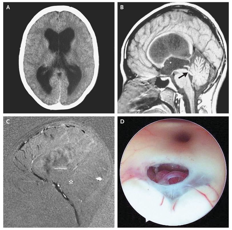 A 21-year-old woman presented with somnolence and confusion. She reported having progressively worsening headaches, nausea, and vomiting over the previous 5 months. Funduscopic examination showed bilateral papilledema as a clinical sign of intracranial hypertension. Computed tomography (Panel A) and magnetic resonance imaging (MRI) showed supratentorial hydrocephalus due to aqueductal stenosis (Panel B, arrow). Sagittal cine-phase MRI with the administration of contrast material showed a lack of flow-signal intensity at the aqueduct level (Panel C, asterisk). The patient received a diagnosis of idiopathic aqueductal stenosis, the most common form of obstructive hydrocephalus in adults. There was no evidence of a secondary cause of aqueductal stenosis, such as a tumor, infectious ventriculitis, or intraventricular hemorrhage. An endoscopic ventriculostomy was performed (Panel D) (seeΒ videos) by opening the floor of the third ventricle into the subarachnoid space of the brain-stem cisterns. This procedure treats idiopathic aqueductal stenosis by restoring the circulation of cerebrospinal fluid, without the need for an external ventriculostomy or ventriculoperitoneal shunt. There were no complications, such as meningitis, severe bleeding, new onset of neurologic deficits, leak of cerebrospinal fluid, or pneumocephalus. The patient had a good response to the procedure, with complete neurologic recovery. Five years later, she remained asymptomatic, and MRI showed no recurrence of hydrocephalus.