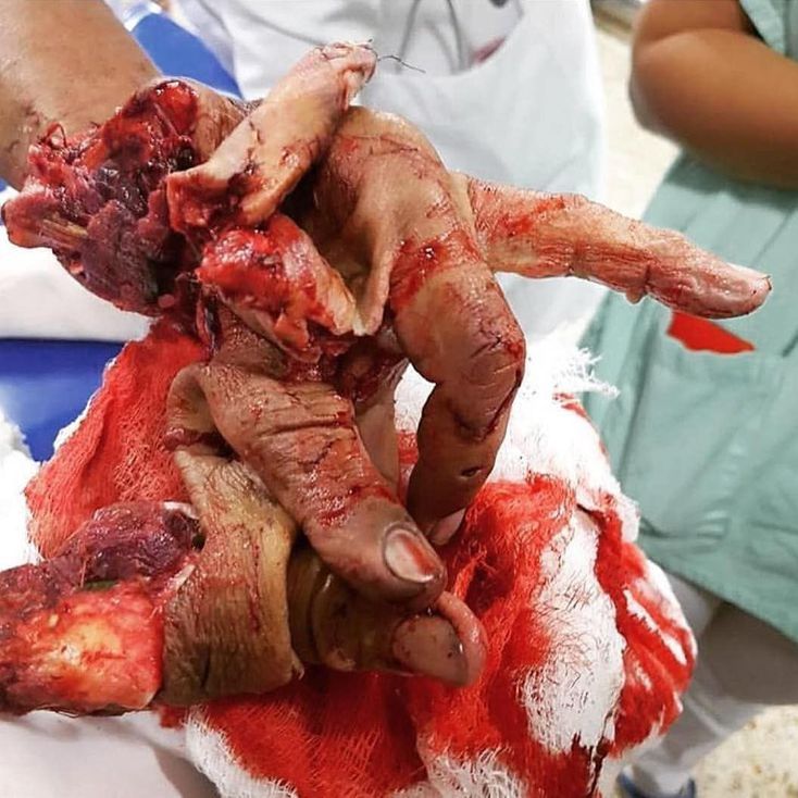 Maximum restoration of the injured hand can nowadays be accomplished by careful extrication, followed by preservation and reconstruction of all viable tissues. Perioperative antibiotics and wound irrigation with antibiotic solution are recommended. Unfortunately in this case, the trauma was too severe, leading to multiple finger amputation.