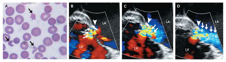An 80-year-old woman with a history of mitral-valve repair presented with fatigue. On examination, she had normal vital signs and markedly pale conjunctivae. A grade 3/6 pansystolic murmur was audible at the apex, with radiation to the back. The hemoglobin level was 8 g per deciliter. Hematologic studies revealed indirect hyperbilirubinemia (total bilirubin level, 5.1 mg per deciliter [87 μmol per liter]), a lactate dehydrogenase level of 8320 U per liter, and a negative Coombs' test. A peripheral-blood smear showed schistocytes (Panel A, arrows), spherocytes, and polychromasia suggestive of hemolytic anemia. Transesophageal echocardiography showed a jet of mild transvalvular mitral regurgitation (Panels B, C, and D, arrows; see the video) that immediately collided with the annuloplasty ring (Panels B, C, and D, arrowhead), redirecting the jet in an acute angle into the left atrium (Panel D, arrows). LA denotes left atrium, and LV left ventricle. Residual mitral regurgitation, even if mild, can result in erythrocyte fragmentation. The patient underwent mitral-valve replacement, which resulted in resolution of the hemolysis.