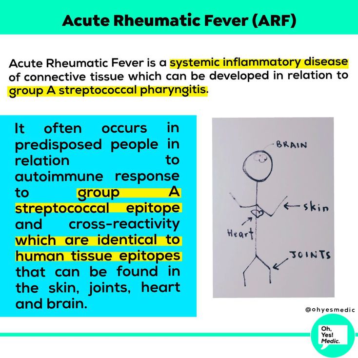 [Acute Rheumatic Fever - ARF] ARF is caused by group A beta-hemolytic Streptococci typically causes inflammation of upper respiratory tracts and results in the development of rheumatic inflammation. Group A beta-hemolytic Streptococci are presented by 80 various strains. Similar antigenic structures are found in: - muscular cells of the myocardium, - glycoproteins of the connective tissue of the heart valves, - cytoplasms of subthalamic and caudate nuclei of the brain, epithelum of cortical and medullar areas of the thalamus. Follow @ohyesmedic on Instagram đđđ