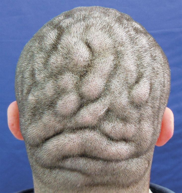 A 21-year-old man presented with scalp changes that had begun 2 years earlier. Physical examination revealed excessive growth of the scalp, with the formation of convoluted folds and furrows in a cerebriform pattern. The patient had intellectual impairment, although he had no symptoms of neurologic or psychiatric disorders. A 4-mm punch-biopsy specimen from the scalp revealed no inflammatory or neoplastic changes. This clinical presentation was consistent with a diagnosis of cutis verticis gyrata, which is an unusual morphologic condition of the scalp characterized by ridges and furrows resembling the brain's surface. No intervention was attempted because the patient had no associated disorders and the condition did not bother him cosmetically. At the 1-year follow-up, there were no changes in the patient's presentation.