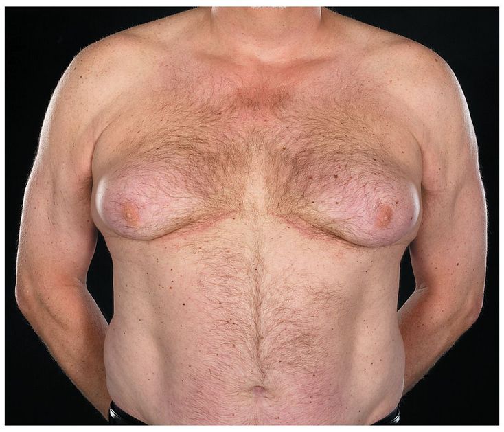 A 60-year-old man presented to the breast clinic with gynecomastia. A high-grade, advanced prostate cancer (T3N1M0; Gleason score, 9 [grade 4 plus grade 5]) had been diagnosed 4 years earlier, and the patient was treated with radiotherapy and adjuvant hormonal therapy. Hormonal treatment consisted of an androgen-receptor inhibitor (bicalutamide at a dose of 150 mg daily) for 2.5 years. Six months after the initiation of treatment, progressive enlargement of the breasts developed, with pain bilaterally. After therapy was discontinued, the pain resolved; however, the size of the breasts remained static and caused the patient considerable social embarrassment. Examination of the breasts did not reveal any suspicious abnormality. Surgical correction was performed. Gynecomastia occurs in up to 80% of patients who receive nonsteroidal antiandrogens (e.g., bicalutamide, flutamide, or nilutamide), usually within the first 6 to 9 months after the initiation of treatment.