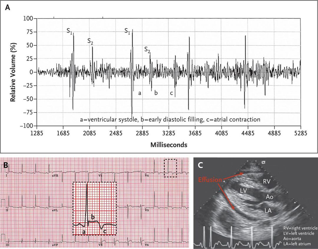 A 33-year-old soldier presented with a 5-day history of unremitting substernal chest pain that radiated to his shoulders. The pain was worse when he was lying down and improved when he leaned forward. He reported having no dyspnea. He had no chest-wall tenderness and had not undergone any recent trauma. Laboratory analysis revealed an elevation in the white-cell count, erythrocyte sedimentation rate, and fibrin D-dimer level. In the emergency department, his cardiac-enzyme levels were found to be normal, as were results on computed tomography for pulmonary embolism. The next day, a three-component friction rub was heard during auscultation An electrocardiogram showed PR-segment depression (Panel B, label a) with elevation in lead aVR, diffuse ST-segment elevation (Panel B, label b) with depression in lead aVR, and T-wave inversion in the precordial leads (Panel B, label c). A moderate-sized and hemodynamically insignificant pericardial effusion was seen on echocardiography (Panel C). No cause of the acute pericarditis was found. The patient's condition improved with the administration of ibuprofen and colchicine.