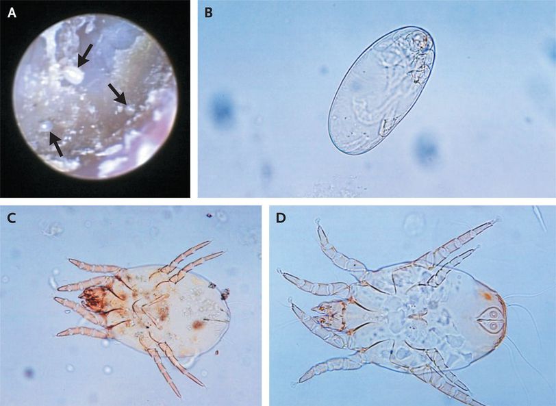 A 70-year-old man presented with a 2-month history of pruritus and a sense of fullness in the right ear. There was no hearing impairment, tinnitus, or otorrhea. Otoscopic examination revealed a number of mites (Panel A, arrows) and mite eggs in the right external auditory canal (see video). Extracted mites were identified as the house-dust mite Dermatophagoides pteronyssinus (Panel B, mite egg; Panel C, female mite; Panel D, male mite). Otoacariasis, the infestation of the external auditory canal by various genera of mites or ticks, is not uncommon in livestock and domestic animals but is less common in humans. House-dust mites are found in human habitations worldwide and feed on flakes of shed human skin. The patient was treated with eardrops containing triamcinolone, nystatin, neomycin, and gramicidin, and when he was seen in follow-up 2 months later, his symptoms had resolved.