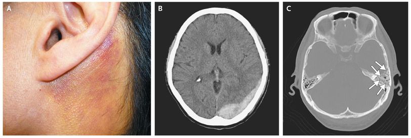 A 46-year-old man presented to the otolaryngology clinic with hearing loss and a sensation of fullness in the left ear. The symptoms had started a few days before presentation. He had no other neurologic symptoms. Otoscopy revealed a hemotympanum through the eardrum. In addition, a subcutaneous hemorrhage was observed in the left postauricular region (Panel A). The patient reported no history of head injury but said that he had been having partial memory blackouts since drinking alcohol at a New Year's party 5 days earlier. Computed tomography revealed an acute epidural hematoma (Panel B), accompanied by a left temporal bone fracture (Panel C, arrows). The patient was sent to the neurosurgery department for evaluation, where it was determined that no intervention was required. The patient's symptoms improved over the next several weeks, with the exception of slight sensorineural hearing loss in the left ear, detected on audiometry. Battle's sign represents ecchymosis around the mastoid process from head trauma that has caused a temporal bone fracture. The sign can suggest that a patient has sustained a significant blow to the skull, even if the medical history is obscure.