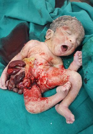Gastroschisis is a birth defect of the abdominal (belly) wall. The baby's intestines are found outside of the baby's body, exiting through a hole beside the belly button. The hole can be small or large and sometimes other organs, such as the stomach and liver, can also be found outside of the baby's body