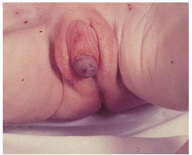 Physical examination of a neonate shows peculiar genitalia (shown in the image). Cytogenetic studies reveal a 46, XX karyotype. Laboratory studies will most likely reveal a deficiency of which of the following? A-G6PD B-Hydrocotisone C-Growth Hormone D-21 hydroxylase