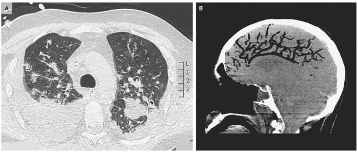 A 42-year-old man had acute respiratory failure after receiving all-trans retinoic acid for the treatment of acute promyelocytic leukemia. Computed tomography (CT) of the chest revealed multiple nodular lesions (Panel A), which on biopsy showed invasive aspergillus species. The patient was treated with antifungal therapy and received mechanical ventilation. His clinical condition was improving when he had an episode of sudden and severe hemoptysis, followed by cardiac arrest. He was resuscitated, but subsequently a severe neurologic deficit developed. A brain CT scan revealed cerebral air embolism, especially in the anterior arterial-circulation territory, with accompanying cerebral edema (Panel B). Cerebral air embolism can be caused by positive-pressure maneuvers performed during cardiac resuscitation, lung biopsy, and the placement of venous catheters in the presence of a patent foramen ovale. Lung biopsy was not performed in this patient, and venous catheters were already in place. Cardiac resuscitation maneuvers were the likely cause of the condition in this patient. Diffuse cerebral edema developed, and the patient was declared brain dead on the fifth day after diagnosis.
