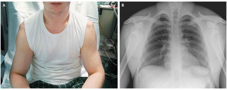 A 34-year-old man with a history of recurrent dislocations of both shoulders presented with sudden excruciating pain in both arms and an inability to move either of them, after attempting to lift a weight equal to his body weight above his head in the gym. On physical examination, the patient was unable to move either shoulder, and squaring of the normal shoulder contour was observed bilaterally (Panel A). Radiographs showed the anterior and inferior positions of the humeral head relative to the glenoid fossa (Panel B). The patient received a diagnosis of bilateral anterior shoulder dislocation. After the patient received morphine for pain relief, the shoulder dislocations were reduced individually with the use of gentle external rotation. Anterior shoulder dislocation accounts for the majority of joint dislocations seen in the emergency department. The diagnosis of dislocation is based on a number of factors, including pain and range of movement of the afflicted joint. Asymmetry of the joint typically heralds a dislocation. When bilateral dislocation occurs, this clinical asymmetry is absent, so attention must be paid to the clinical history and physical findings.