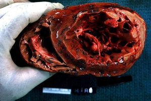 This is a gross horizontal section of the left ventricle looking toward the base of heart. A great example of lateral wall transmural infarct and ruptured papillary muscle. Broadly speaking, the lateral wall of the LV is supplied by branches of the left anterior descending (LAD) and left circumflex (LCx) arteries. Infarction of the lateral wall usually occurs as part of a larger territory infarction, e.g. anterolateral myocardial infarction, and is caused by thrombosis in the artery. Complications of acute myocardial infarction (MI) include ischemic, mechanical, arrhythmic, embolic, and inflammatory disturbances. Nevertheless, circulatory failure from severe left ventricular dysfunction or one of the mechanical complications of MI account for most fatalities. There are three catastrophic mechanical complications of acute MI. These include left ventricular free wall rupture, rupture of the interventricular septum, and papillary muscle rupture. All involve loss of structural integrity of the infarcted tissue and are associated with extraordinarily high mortality rates if not promptly recognized and treated. Papillary muscle rupture frequently presents with symptoms ranging from acutely decompensated heart failure to cardiogenic shock. The most frequent scenario involves infarction upstream from the posterior descending artery (i.e. the right coronary artery in right dominant systems or the left circumflex artery in left dominant systems). Valvular competence during ventricular systole is maintained by the actions of two papillary muscles (anterolateral and posteromedial). The anterolateral muscle typically has a dual blood supply while the posteromedial muscle is supplied from only the PDA. Therefore the posteromedial muscle is more susceptible to infarction and rupture. Rupture leads to acute mitral valve regurgitation, pulmonary edema, and cardiogenic shock. Treatment often necessitates emergent surgical intervention, with mitral valve repair (if muscle necrosis is limited) or valve replacement. Photo by Peter Anderson.