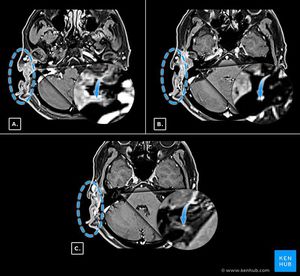 A43yr old male with (NF1)was seen because of a growing subcutaneous tumor of the right postauricular region .the tumor had been partially resected previously and had been shown histologically to be malignant peripheral nerve sheath tumor (MPNST)which presumably developed from a benign neurofibromatosis tumor .the patient didn’t have facial nerve paralysis or hearing impairment!!!MRI showed subcutaneous lesions from the enlarged stylomastoid foramen and also enlarged facial canal
