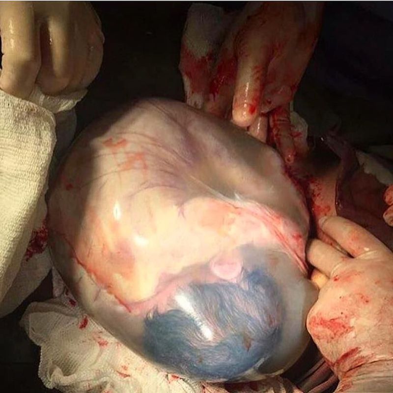 Breathtaking photo of a rare "en caul" birth, in which the baby is seen completely enclosed in the amniotic sac!