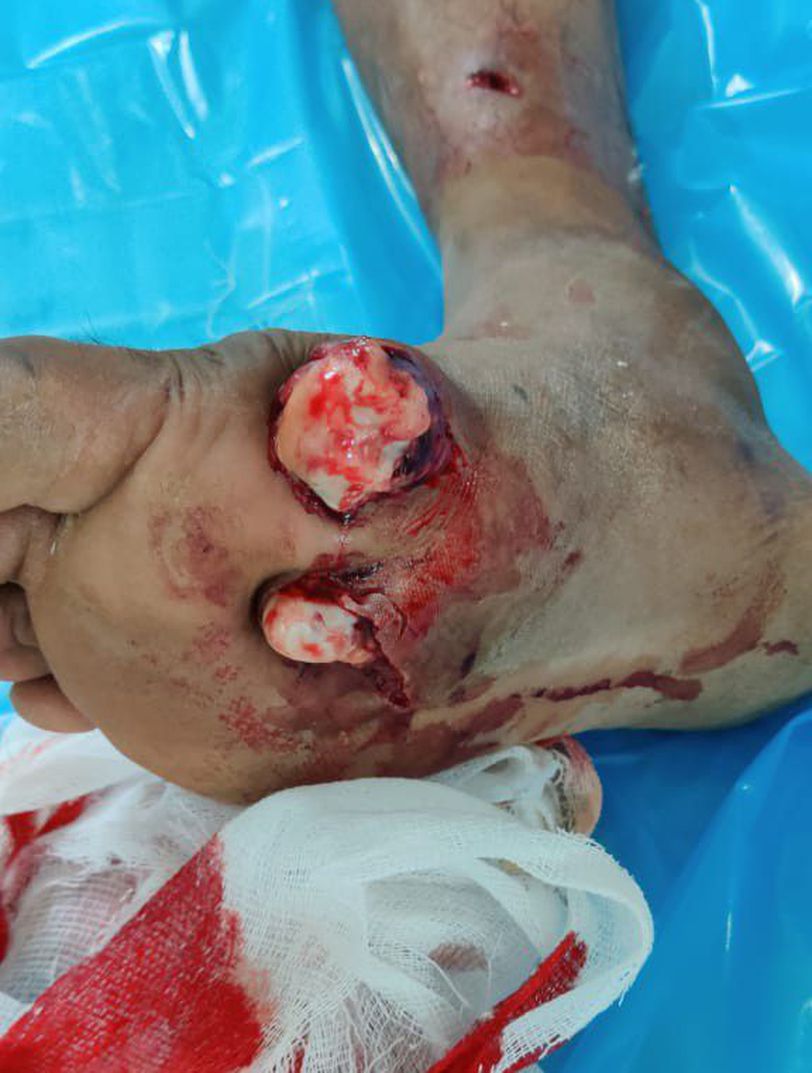 Patient of RTA came to casualty with open wound at foot. 1st and 2nd metatarsal can be seen through the wound. Patient is treated with traction and reduction of metatarsal . Sutures and slab was applied and patient was given medication for pain and antibiotics for infection