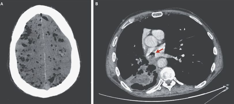 A 61-year-old man with a history of stage IIIB squamous-cell carcinoma of the lung began to have seizurelike activity while he was undergoing restaging computed tomography (CT) in the hospital. He had a known primary cavitary lesion in the right lower lobe and had previously received three cycles of carboplatin and nanoparticle albumin-bound paclitaxel (Abraxane). He was transported to the emergency department. Sudden respiratory failure and confusion developed, which resulted in emergency intubation. CT of the head revealed diffuse pneumocephalus (Panel A). The restaging CT scan of the chest showed that the previously identified cavitary lesion had formed a fistula between a bronchus in the right lower lobe and the left atrium (Panel B, arrow). The pneumocephalus was thought to have been due to an air embolism that had originated from the bronchoatrial fistula. The patient later died in the intensive care unit.