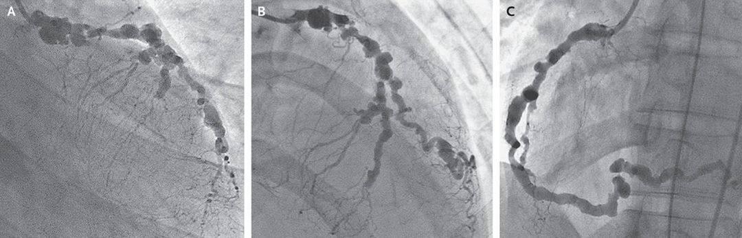 A 25-year-old woman who had just undergone cardiac arrest due to ventricular fibrillation was brought to the hospital and admitted and was thereafter successfully resuscitated and cooled. Initially, no additional history could be obtained. Serial electrocardiography revealed marked anterolateral ST-segment depressions. Findings on coronary angiography were consistent with severe generalized coronary arteritis (Panels A, B, and C). Her coronary disease was deemed unamenable to intervention. Her history revealed that she had been given a diagnosis of polyarteritis nodosa 3 years earlier and was receiving prednisolone maintenance therapy. Previous angiography had shown extensive coronary artery involvement but only minor left ventricular dysfunction. The current images showed significant progression of angiographic disease, including new critical stenoses of the proximal left anterior descending artery and the posterior left ventricular branch. Although severe cardiac involvement in polyarteritis nodosa is unusual, it can result in myocardial infarction and confers a poorer prognosis. Soon after the patient was treated at the hospital, recurrent pulmonary edema developed as a result of severe mitral regurgitation and left ventricular dysfunction. Given the extensive extracardiac disease, she was not a candidate for cardiac transplantation. Azathioprine was added to her treatment with prednisolone, but the patient died within several months.