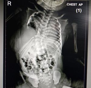 It is Congenital absence of ribs and herniation of liver in to left chest ( diaphragmatic hernia), with flail chest type respiration, cardiac shadow is very well on left side with rib anomalies