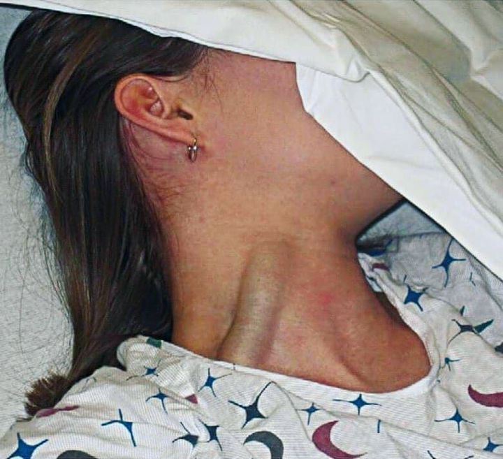 Jugular vein distention, which is quite massive, in a woman with cardiac tamponade! Jugular vein distention occurs when the pressure inside the vena cava increases and appears as a bulge running down the right side of a person's neck. A person has jugular veins on both sides of their neck. They act as passageways for blood to move from a person's head to the superior vena cava, which is the largest vein in the upper body. The superior vena cava then transports the blood to the heart and lungs. Jugular vein distention or JVD is when the increased pressure of the superior vena cava causes the jugular vein to bulge, making it most visible on the right side of a person's neck. The blood flow from the head to the heart is measured by central venous pressure or CVP. The appearance of the vein is similar to a rope or raised tube below the surface of the skin, and its height can be measured to indicate the CVP. There are several reasons why JVD may occur, and these include right-sided heart failure, tricuspid valve stenosis, pulmonary hypertension, constrictive pericarditis, superior vena cava obstruction, and cardiac tamponade. In cardiac tamponade, we look for 3 things, one of them you can see in the picture. These 3 things are called Beck's triad which is a collection of three medical signs associated with acute cardiac tamponade, an emergency condition wherein fluid accumulates around the heart and impairs its ability to pump blood. The signs are low arterial blood pressure, distended neck veins, and distant, muffled heart sounds. Credit to: @medicaltalks
