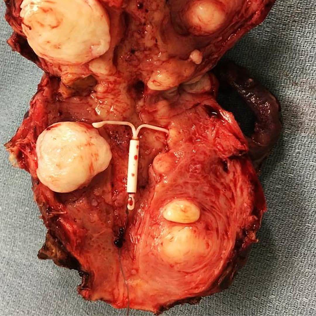Uterine leiomyomas (fibroids) are benign, hormone-sensitive uterine neoplasms. These tumors are classified as either submucosal (beneath the endometrium), intramural (within the muscular uterine wall of the uterus), or subserosal (beneath the peritoneum). They seldom develop in the cervix, the lower part of the uterus. When they do, they are usually accompanied by myomas in the larger upper part of the uterus, which are also called fibroids. The larger ones can cause blockage of the urinary tract or even protrude (prolapse) into the vagina. Symptoms depend on the location, size, and number of myomas, and include menstrual abnormalities (menorrhagia), features of mass effects (e.g., back/abdominal/pelvic pain or bladder and bowel dysfunction), and infertility. If left untreated, infections may develop, causing further blessing, pain and vaginal discharge. Pelvic physical examination can detect lump in the abdomen (of the myomas are large enough) and the patient experiences feelings of pressure. Ultrasound are used to confirm the diagnosis and to visualize and determine sizes. If myomas are small and do not cause any symptoms, no treatment is needed. If they cause symptoms, they are surgically removed if possible (a procedure called myomectomy). Myomectomy (excision of the subserosal or intramural fibroids only) is preferred for women planning future pregnancies. However, if myomas are large, removal of the entire uterus (hysterectomy) may be necessary. The procedure can be done by making a large incision in the abdomen (laparotomy) or by instruments inserted through one or more small incisions near the navel (laparoscopy), which is less invasive and is associated with less intra and post-operative complications.