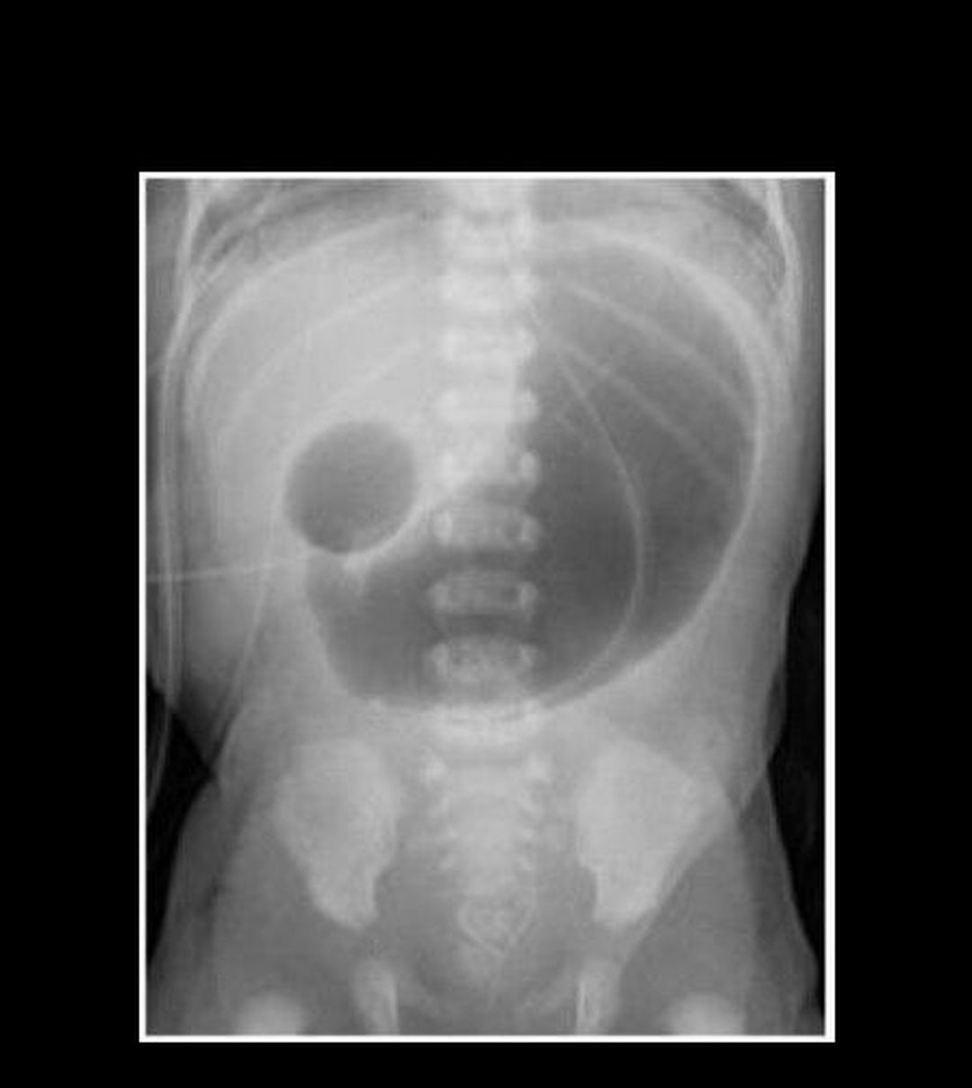 Radiography shows a distended stomach and distended duodenum, which are separated by the pyloric valve, a finding described as the double-bubble sign. This is characteristic of Duodenal atresia, also known as duodenojejunal atresia. The air is trapped in the stomach and proximal duodenum, which are separated by the pyloric sphincter, creating the appearance of two bubbles visible on x-ray. Duodenal atresiais the congenital absence or complete closure of a portion of the lumen of the duodenum. It causes increased levels of amniotic fluid during pregnancy (polyhydramnios) and intestinal obstruction in newborn babies.