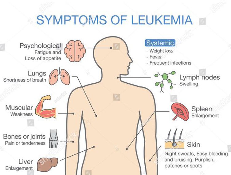 Leukemia is cancer of the body's blood-forming tissues, including the bone marrow and the lymphatic system. Many types of leukemia exist. Some forms of leukemia are more common in children. Other forms of leukemia occur mostly in adults. Leukemia usually involves the white blood cells. Your white blood cells are potent infection fighters — they normally grow and divide in an orderly way, as your body needs them. But in people with leukemia, the bone marrow produces abnormal white blood cells, which don't function properly. Treatment for leukemia can be complex — depending on the type of leukemia and other factors. But there are strategies and resources that can help to make your treatment successful. Leukemia symptoms vary, depending on the type of leukemia. Common leukemia signs and symptoms include: Fever or chills Persistent fatigue, weakness Frequent or severe infections Losing weight without trying Swollen lymph nodes, enlarged liver or spleen Easy bleeding or bruising Recurrent nosebleeds Tiny red spots in your skin (petechiae) Excessive sweating, especially at night Bone pain or tenderness. The major types of leukemia are: Acute lymphocytic leukemia (ALL). This is the most common type of leukemia in young children. ALL can also occur in adults. Acute myelogenous leukemia (AML). AML is a common type of leukemia. It occurs in children and adults. AML is the most common type of acute leukemia in adults. Chronic lymphocytic leukemia (CLL). With CLL, the most common chronic adult leukemia, you may feel well for years without needing treatment. Chronic myelogenous leukemia (CML). This type of leukemia mainly affects adults. A person with CML may have few or no symptoms for months or years before entering a phase in which the leukemia cells grow more quickly. Other types. Other, rarer types of leukemia exist, including hairy cell leukemia, myelodysplastic syndromes and myeloproliferative disorders. Factors that may increase your risk of developing some types of leukemia include: Previous cancer treatment. People who've had certain types of chemotherapy and radiation therapy for other cancers have an increased risk of developing certain types of leukemia. Genetic disorders. Genetic abnormalities seem to play a role in the development of leukemia. Certain genetic disorders, such as Down syndrome, are associated with an increased risk of leukemia. Exposure to certain chemicals. Exposure to certain chemicals, such as benzene — which is found in gasoline and is used by the chemical industry — is linked to an increased risk of some kinds of leukemia. Smoking. Smoking cigarettes increases the risk of acute myelogenous leukemia. Family history of leukemia. If members of your family have been diagnosed with leukemia, your risk of the disease may be increased.