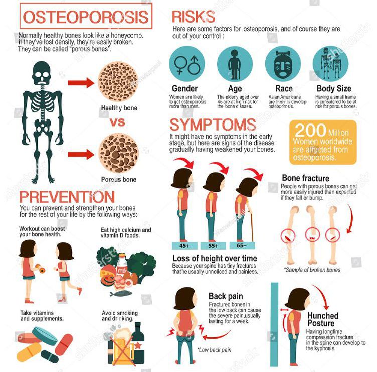 Osteoporosis causes bones to become weak and brittle — so brittle that a fall or even mild stresses such as bending over or coughing can cause a fracture. Osteoporosis-related fractures most commonly occur in the hip, wrist or spine. Bone is living tissue that is constantly being broken down and replaced. Osteoporosis occurs when the creation of new bone doesn't keep up with the loss of old bone. Osteoporosis affects men and women of all races. But white and Asian women — especially older women who are past menopause — are at highest risk. Medications, healthy diet and weight-bearing exercise can help prevent bone loss or strengthen already weak bones. There typically are no symptoms in the early stages of bone loss. But once your bones have been weakened by osteoporosis, you might have signs and symptoms that include: Back pain, caused by a fractured or collapsed vertebra Loss of height over time A stooped posture. A bone that breaks much more easily than expected. You might want to talk to your doctor about osteoporosis if you went through early menopause or took corticosteroids for several months at a time, or if either of your parents had hip fractures. Your bones are in a constant state of renewal — new bone is made and old bone is broken down. When you're young, your body makes new bone faster than it breaks down old bone and your bone mass increases. After the early 20s this process slows, and most people reach their peak bone mass by age 30. As people age, bone mass is lost faster than it's created. How likely you are to develop osteoporosis depends partly on how much bone mass you attained in your youth. Peak bone mass is somewhat inherited and varies also by ethnic group. The higher your peak bone mass, the more bone you have "in the bank" and the less likely you are to develop osteoporosis as you age. A number of factors can increase the likelihood that you'll develop osteoporosis — including your age, race, lifestyle choices, and medical conditions and treatments