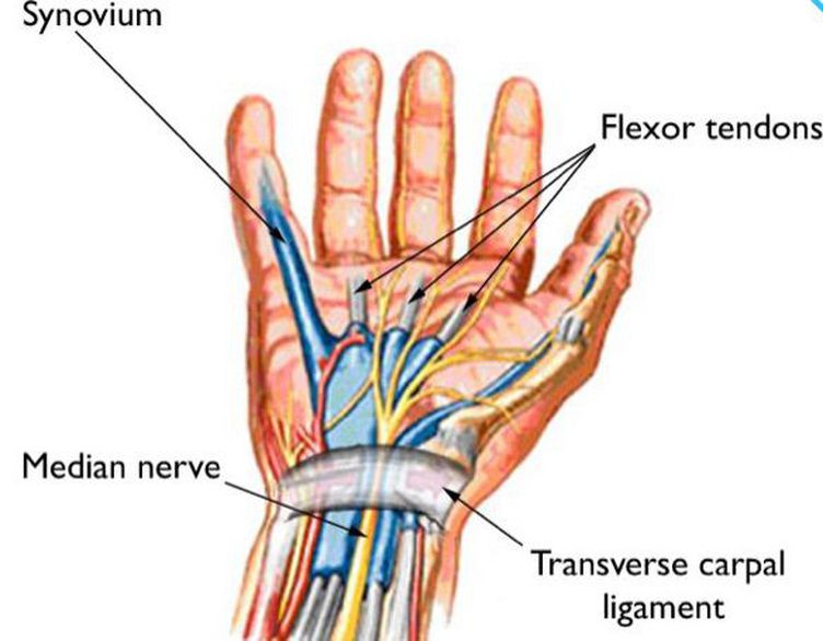 Carpal tunnel syndrome is caused by pressure on the median nerve. The carpal tunnel is a narrow passageway surrounded by bones and ligaments on the palm side of your hand. When the median nerve is compressed, the symptoms can include numbness, tingling and weakness in the hand and arm. The anatomy of your wrist, health problems and possibly repetitive hand motions can contribute to carpal tunnel syndrome.Proper treatment usually relieves the tingling and numbness and restores wrist and hand function. Carpal tunnel syndrome symptoms usually start gradually and include: Tingling or numbness. You may notice tingling and numbness in your fingers or hand. Usually the thumb and index, middle or ring fingers are affected, but not your little finger. You might feel a sensation like an electric shock in these fingers. The sensation may travel from your wrist up your arm. These symptoms often occur while holding a steering wheel, phone or newspaper, or may wake you from sleep. Many people "shake out" their hands to try to relieve their symptoms. The numb feeling may become constant over time. Weakness.You may experience weakness in your hand and drop objects. This may be due to the numbness in your hand or weakness of the thumb's pinching muscles, which are also controlled by the median nerve. See your doctor if you have signs and symptoms of carpal tunnel syndrome that interfere with your normal activities and sleep patterns. Permanent nerve and muscle damage can occur without treatment. Carpal tunnel syndrome is caused by pressure on the median nerve. The median nerve runs from your forearm through a passageway in your wrist (carpal tunnel) to your hand. It provides sensation to the palm side of your thumb and fingers, except the little finger. It also provides nerve signals to move the muscles around the base of your thumb (motor function). Anything that squeezes or irritates the median nerve in the carpal tunnel space may lead to carpal tunnel syndrome. A wrist fracture can narrow the carpal tunnel and irritate the nerve, as can the swelling and inflammation caused by rheumatoid arthritis.Many times, there is no single cause of carpal tunnel syndrome. It may be that a combination of risk factors contributes to the development of the condition.