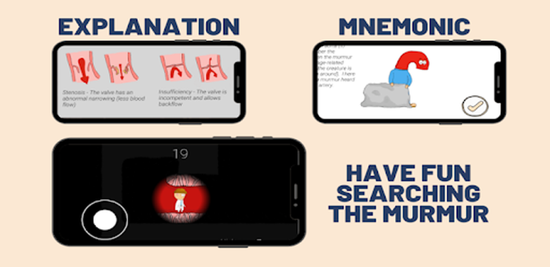We'll make it short and simple. These are the problems you face and our solution for it: 1.Hard to understand medicine Books --> βπ We got Good explenations and pictures 2.You can't remember all murmurs --> βπ visual Mnemonics for every Murmur 3.You have no way to practice --> βπ Get a lot of Practice in a fun and gamified way 4.Traditional ways are boring --> βπ You study and beat your highscore while doing it For medical students, nurses, physicians or medical interested people. Do you know what tool is associated with medicine the most? Yes, a stethoscope. Therefore it is key to master the art of heart auscultation. With this app you'll get insights about the function of the human heart. β for free β Basic knowledge of medicine helps you to use this app in an optimal way. We wont replace your professor or teacher but help you to sharpen your skills.