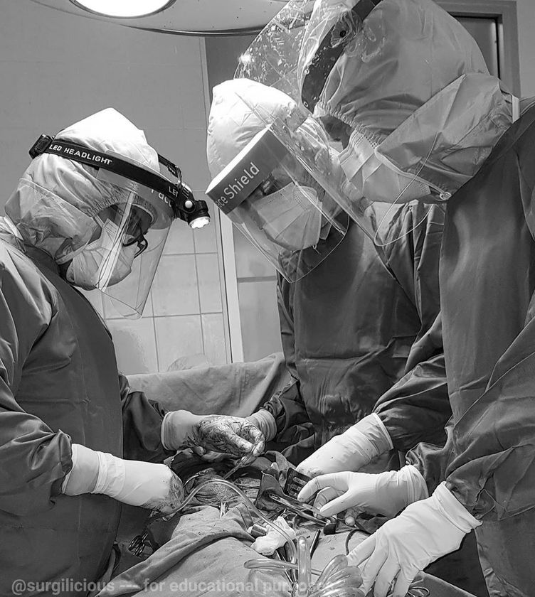 Inserting drain after exploratory laparotomy Drains are designated to evacuate intraperitoneal fluid collections. They can be used for diagnostic, prophylactic, or therapeutic purposes. In upper gastrointestinal surgery, diagnostic drains are mainly placed to assess intraperitoneal fluid collections in order to establish a diagnosis. These drains are seldom left in place and are, therefore, of minor importance. In contrast, prophylactic drains placed at the end of an operation are used frequently with two intentions: first, to prevent fluid accumulations which could be harmful (i.e., pancreatic juice or bile) or to evacuate fluid collections that can become infected and lead to the formation of intra-abdominal abscesses; second, prophylactic drains may be used to detect early postoperative complications, such as intra-abdominal bleeding or anastomotic leakage. The drain orifice through the skin is created by a penetrating cut with a scalpel. A Kelly clamp is inserted into the orifice and penetrates the abdominal wall diagonally. The hand serves as protection to prevent bowel injury. This technique creates a tunnel that helps to seal the abdominal cavity after drain removal. After clamping the drain tip, the Kelly clamp and drain are pulled through the abdominal wall from inside outwards. Others prefer to create the tunnel from inside out and pull the drain into the abdomen. Finally, the drain position is secured by a non-reactive skin suture. #surgeon #surgery #doctor #medicalstudent #blackandwhitephotography #photooftheday