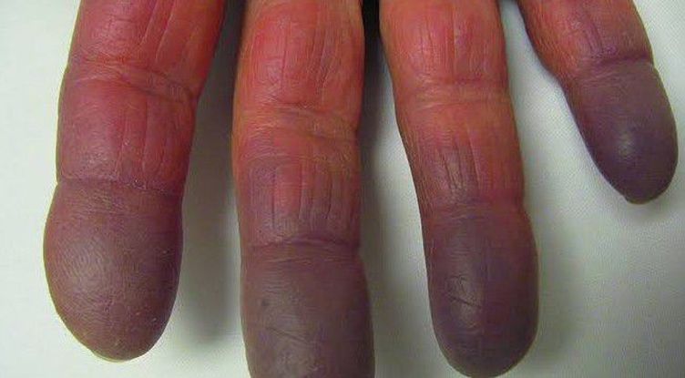 Peripheral cyanosis. It has many causes. For example, it could be 2nd phase of Raynaud Phenomenon.