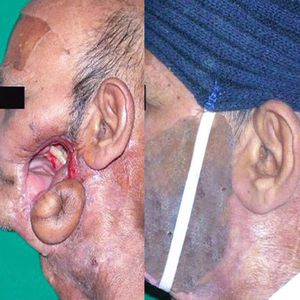 A 55-year-old male patient was diagnosed with squamous cell carcinoma of the left buccal mucosa and involving the alveolus of the same side. Surgical treatment resulted in an orofacial communication. Surgical reconstruction was done using the forehead skin graft. Unfortunately the graft was omitted and the tissue contraction and scarring formed a lump near the lower border of the mandible. Later, the patient was referred to the prosthetic treatment for the restoration of the defect. The patient's chief complaint was the escape of food and fluids through the orofacial communication The dehiscence defect was found on the left cheek and the patient expressed his desire to have a prosthesis that would improve function and esthetics. The defect was packed with lubricated gauze to prevent intrusion of the impression material into the oral cavity. The defect impression was made using irreversible hydrocolloid. The prosthesis was waxed to form. It was verified on the patient's face during the try-in appointment, and minor corrections to the wax-up were made. The waxed prosthesis was invested and the mold prepared. Intrinsically colored silicone was packed into the mold. The silicone cheek prosthesis was retrieved and finished. The prosthesis was placed on the patient. It was retained using elastic straps that were attached to the head cap. The prosthesis was found to be seated well with an effective seal during function. Follow-up was done once in a month for six months and the patient had no complaints.