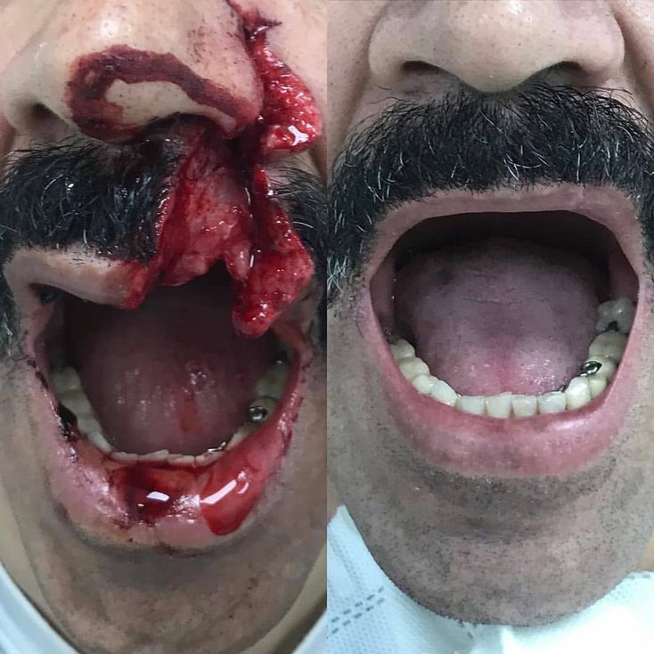 The patient sustained lacerations going through the left nostril and extending downwards, splitting up the upper lip. The right picture shows the patient post-op, showing great aesthetic and functional results with barely noticable scar. Aesthetically pleasing wound closure can be achieved with thorough debridement, resection of wound edges and careful layered functional closure after reduction and fixation of potential facial bone injuries. However the injuries produced can often be disfiguring, permanently disabling or even fatal and are mostly preventable. Before using such a power tool proper protective gear should be worn. Credit: @reconst.surg.col
