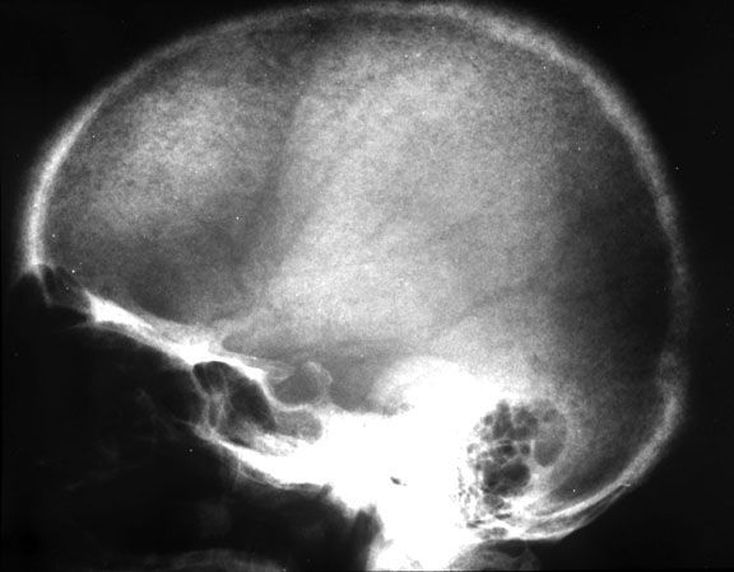 Parathyroid hormone is the main hormone that maintains a balance of calcium and phosphate in our bodies. When released, parathyroid hormone increases the release of calcium from the bone, reabsorption from the kidney, and secondarily stimulates absorption of calcium from the intestines. It also stimulates secretion of phosphate in the kidney. Hyperparathyroidism is the abnormal secretion of parathyroid hormone. Clinical findings: The classic medical school clinical findings are "Stones, Bones, abdominal moans, and psychiatric overtones," referring to renal calculi, bone pain, peptic ulcers, pancreatitis, and CNS symptoms (confusion lethargy, weakness). Depending on the etiology, the serum calcium may be elevated and phosphate may be decreased. Etiology: Primary Hyperparathyroidism Excessive parathyroid hormone due to a parathyroid gland abnormality 80% parathyroid adenoma 12% parathyroid hyperplasia (rarely from Multiple endocrine neoplasia) 1-3% parathyroid carcinoma Secondary Hyperparathyroidism Excessive parathyroid hormone due to an abnormality elsewhere in the body. Most often this is from chronic renal failure where elevated phosphate and +/- decreased calcium lead to chronic stimulation of the parathyroid gland. Tertiary Hyperparathyroidism Excessive parathyroid hormone due to autonomous secretion of parathyroid hormone. Often this is from prolonged secondary hyperparathyroidism from renal failure. Then, when the patient receives a renal transplant, cause of the secondary hyperparathyroidism is taken away, but the parathyroid glands continue to over secrete parathyroid hormone. Skull shows granular decalcification giving appearance of salt and pepper.
