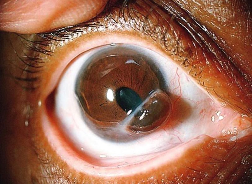 Prolapse of the iris is frequently encountered following trauma, during cataract surgery (referred to as intraoperative floppy iris syndrome), through a perforated corneal ulcer, or through a corneal melt. Depending on the duration of prolapse, the appearance of the iris may vary. In peripheral iris prolapse, the iris appears as a knuckle of colored tissue, resulting in a partial peripheral synechia. When the prolapse is central, the entire pupillary margin may prolapse, resulting in a total anteriorsynechia. Prompt surgical management is necessary when conjunctival coverage is not present or in the presence of complications. The primary goal of surgery is to restore the anatomical integrity of the eye with visual restoration being only a secondary goal. The iris should be either repositioned or excised. Reposition is achieved when acetylcholine is instilled through a paracentesis incision into the anterior chamber, which constricts the pupil and may release the iris incarceration. If the iris does not appear viable, then it is excised.The iris should be excised if signs of epithelialization are present. To excise, the prolapsed iris is cut flush with the corneal surface. Then the iris defect may be closed using a polypropylene suture on a vascular needle.