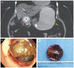 A 57-year-old woman presented to the emergency department with a 2-week history of nausea and vomiting. During the previous month, she had had intermittent episodes of right-upper-quadrant abdominal pain. Abdominal examination revealed a distended abdomen with decreased bowel sounds and mild epigastric tenderness without peritoneal signs. Computed tomography of the abdomen (Panel A) revealed pneumobilia (white arrow), gastric distention (yellow arrow), and a gallstone obstructing the proximal duodenum (red arrow). Bouveret’s syndrome is an uncommon form of gallstone ileus that is characterized by a gastric outlet obstruction caused by impaction of a gallstone in the pylorus or proximal duodenum after its passage through a cholecystoduodenal fistula. Patients with gallstone ileus may present with radiographic findings of Rigler’s triad (i.e., pneumobilia, small-bowel obstruction, and an ectopic gallstone). Mechanical lithotripsy with endoscopic removal of the stone was attempted in the patient (Panel B); however, the procedure was unsuccessful and was complicated by a perforation of the proximal duodenum. The patient then underwent an open laparotomy for repair of the duodenal perforation and removal of a mixed gallstone, which measured 4.4 cm in the greatest dimension (Panel C). She had complete resolution of symptoms and was discharged home 15 days after admission. Guilherme P. Ramos, M.D. Nian-En Chiang, M.D. Mayo Clinic, Rochester, MN source: nejm.org