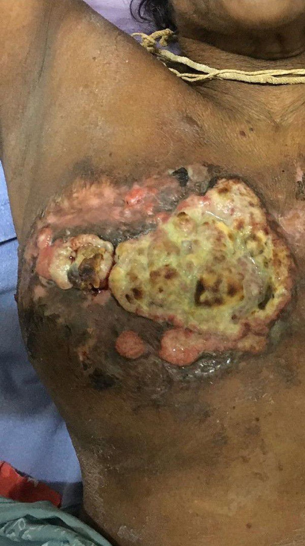 T4 breast cancer. Fungus or cauliflower like appearances chronic pain, freauent infections foul smell, social isolation and general debilitation. Skin involvement has progressed to frank t4b diseases neoadjuvant chemotherapy frequently and mastectomy to breast cancer