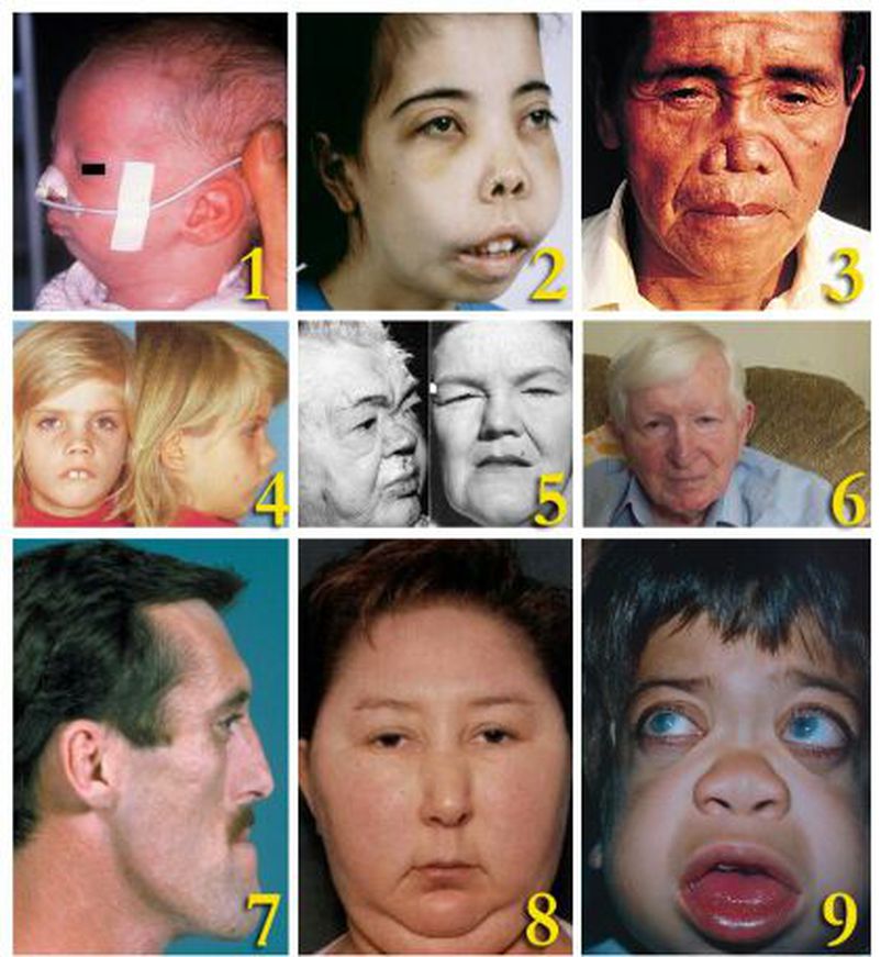1. Bird facies (Pierre Robin Malformation) Small lower jaw, a slit like hole in the palate of mouth (called cleft palate) and the tongue appear to fall into the throat (condition called as retroglossoptosis). 2. Chipmunk facies ( Untreated β Thalassemia major, Bullimia nervosa, Parotid swelling) Expanded globular maxillae, with BM hyperexpansion into facial bones, combined with prominent epicanthal folds. 3. Leonine facies (Lepromatous Leprosy) Peculiar, deeply furrowed, lionlike appearance of the face. 4. Adenoid facies (Adenoid hypertrophy) Long, open-mouthed, dumb-looking face of children. 5. Torpid or Myxedematous facies (Myxedema) Skin generally thickened, alopecia, periorbital oedema, xanthelasma, coolness and dryness of skin and hair, thinning of scalp hair, tongue swelling. 6. Mask like or Parkinsonian facies (Parkinsonism) Mask-like, tremor of head, absence of blinking, dribbling of saliva, weakness of upward gaze, vacant look, seborrhoea and sweatiness. 7. Acromegalic facies (Acromegaly) Large supraorbital ridge and frontal bossing, thickened lips, enlarge tongue, lower jaw firm and square (protruding jaw = prognathism). 8. Cushingoid facies (Cushing syndrome) A rounded face with a double chin, prominent flushed cheeks, and fat deposits in the temporal fossa and cheeks. 9. Gargoyle facies (Hurler syndrome) Head is large and dolichocephalic, with frontal bossing and prominent sagittal and metopic sutures, with mid-face hypoplasia, depressed nasal bridge, flared nares, and a prominent lower 1⁄3 of face, thickened facies, widely spaced teeth and attenuated dental enamel, gingival hyperplasia.