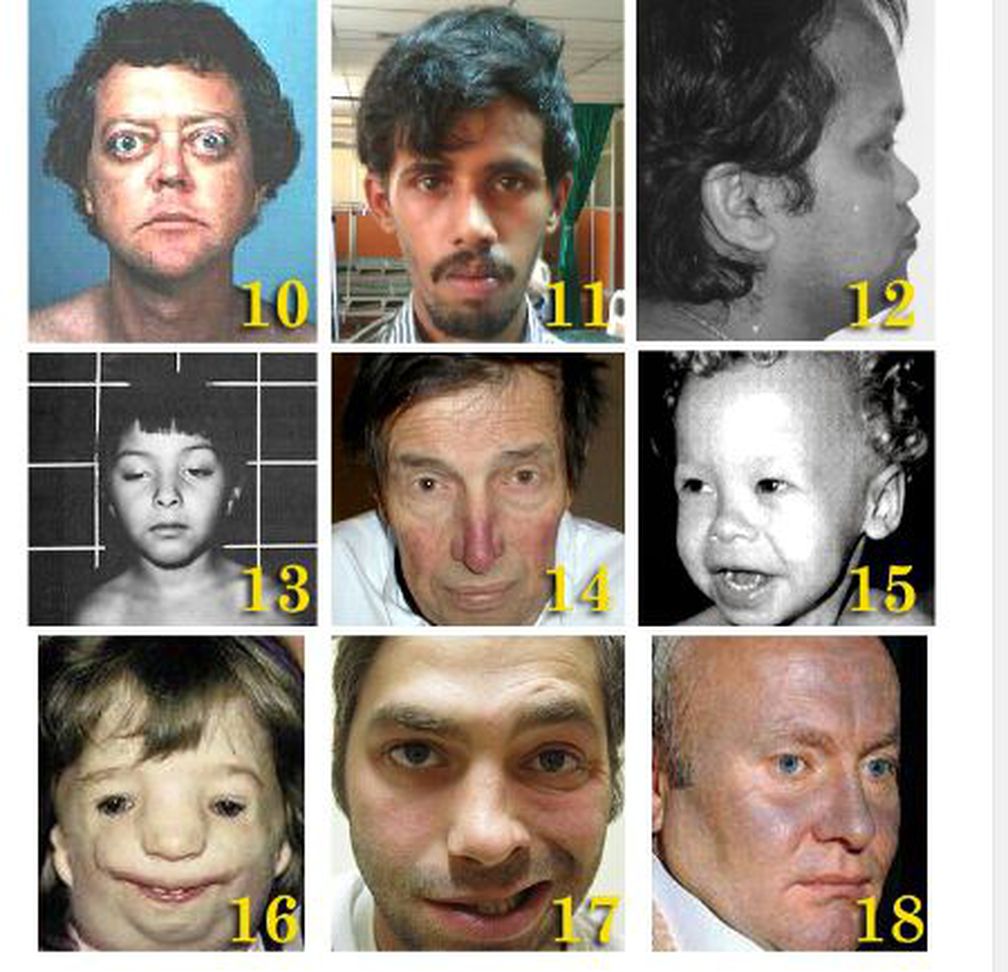 10. Thyrotoxic facies (Grave’s disease) Alert, startled, flushed and anxious appearance. Protrusion of of one or both eyes (exopthamlos) associated with retraction of the upper eyelids (lid lag) which results in the exposure of white conjunctiva above the cornea (Von-Graef’s sign). 11. Hatchet facies (Myotonia atrophica) They have a tented, open mouth, elongated face and blunt affect. This appearance often results from the re-shaping of facial bones in childhood and adolescence due to the progressive pulling and wasting of affected muscles. 12. Flat facies (Down syndrome) Flat appearing face, small head, flat bridge of the nose, smaller than normal, low-set nose, small mouth which causes the tongue to stick out and to appear overly large, upward slanting eyes, epicanthal fold, rounded cheeks, small misshapen ears. 13. Snarling or Myasthenic facies (Myasthenia gravis) Drooping of the eyelids and corners of the mouth and weakness of the facial muscles. 14. Mitral facies (Mitral stenosis) Rosy, flushed cheeks and dilated capillaries. 15. Elfin facies (William’s Syndrome) Sunken nasal bridge, puffiness around eyes, epicanthal fold, blue starry eyes, long upper lip length, small and widely spaced teeth, small chin. 16. Bovine facies (Craniofacial Dysostosis or Crouzon syndrome) Convex nasal profile, shortened mandible, macroglossia. 17. Bell’s palsy (Facial nerve dysfunction) The eyelids on the paralyzed side can’t close. The mouth is drawn to the unparalyzed side, producing a somewhat grotesque appearance. Food and drink dribble from the mouth on the paralyzed side. The eye with the involved lid dries due to decreased tear production. 18. Amiodarone facies Deep blue discoloration around malar area and nose.
