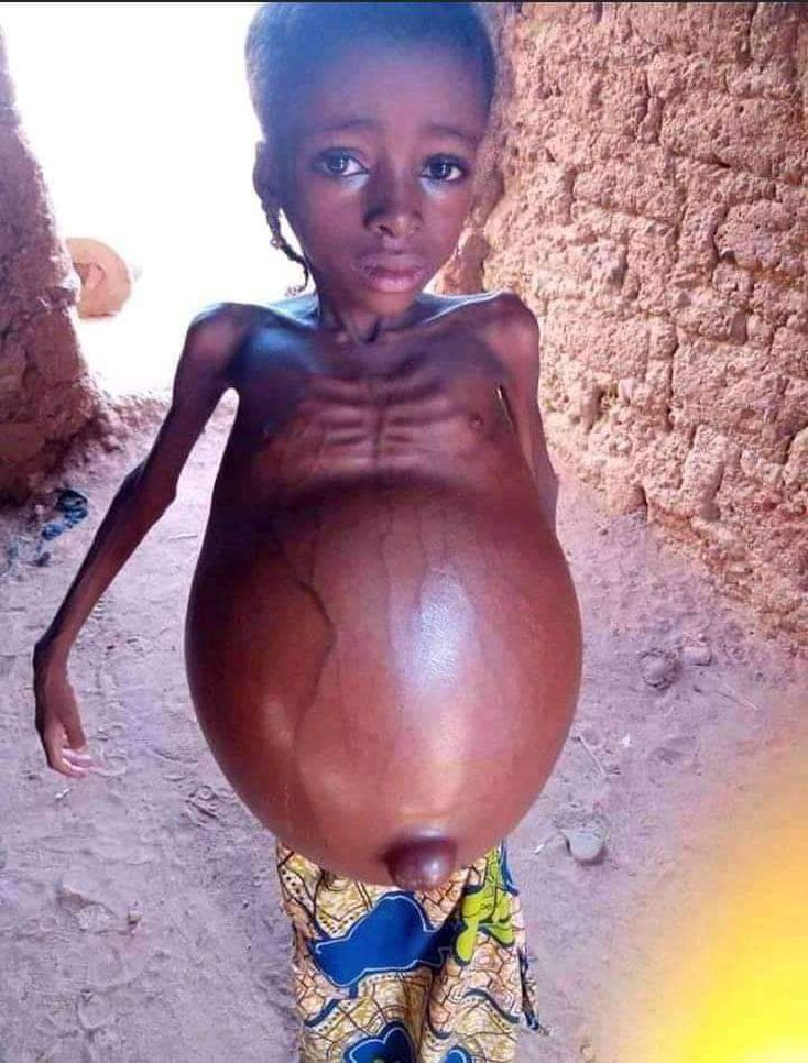 Protein based malnutrition aka kwashiorkor. The ascites is because of 3rd spacing because of low protein levels in the blood. You have to be very diligent when feeding because you can cause fluid and electrolyte imbalances in the process. A jejunal feeding tube with an elemental feeding would be best tolerated initially. Until we solve the social problems that caused this to begin with we are not really civilized.