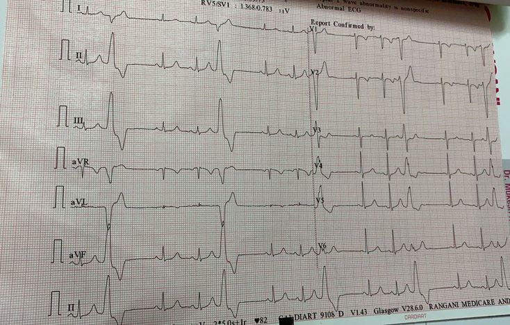 Trigeminal PVCs, low QRS voltage in a couple leads, but no ST elevation when looking at the 2 normal beats between the PVCs. Her heart isn't happy with those PVCs, it would be interesting to repeat ECG every 10 to 15 minutes for charges, and see what her troponin is.
