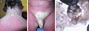 A 71-year-old man with cirrhosis presented to the emergency department with severe diffuse pruritus. Three months earlier, he had presented with erythematous and scaly skin on the scalp and hands. Two skin scrapings had not revealed mites, and he was treated with oral and topical glucocorticoids. After initial improvement, his condition subsequently worsened. Physical examination now revealed a generalized erythematous and scaly rash with intense hyperkeratotic lesions on the face, neck (Panel A), interdigital areas, and genital areas (Panel B). Microscopic examination of a skin scraping from the abdomen confirmed the presence of mites (Panel C), and the diagnosis of crusted scabies was made. Crusted scabies is a rare and severe form of scabies. It is highly contagious because of the large numbers of mites found on the skin. Crusted scabies predominantly affects immunosuppressed patients or those with sensory or motor neuropathy or dementia but can sometimes occur in persons without clear risk factors. An undiagnosed case of crusted scabies may be the source of an outbreak of scabies in health care and residential facilities. The patient was treated with oral ivermectin and topical salicylic acid cream, and his symptoms resolved within 2 weeks after presentation. Source: nejm.org Marta Elosua-González, M.D. Elena García-Zamora, M.D. Hospital Universitario Fundación Alcorcón, Alcorcon, Spain