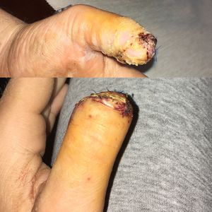 Accident at work with circular saw. The patient reports a confused state and pressure lowering. The circular saw disc has cut the phalanx sharply. The surgeons made a regulation intervention with a fly V-Y flap, finally suture.