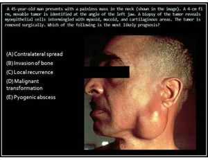 The answer is C: Local recurrence. Pleomorphic adenoma is the most common tumor of the salivary glands. It is a benign neoplasm characterized by a biphasic appearance which represents an admixture of epithelial and stromal elements. At surgery, tumor projections can be missed if the tumor is not carefully dissected. Tumor implanted during surgery or tumor nodules left behind continue to grow as recurrences in the scar tissue of the previous operation. Recurrence of pleomorphic adenoma represents local growth and does not refl ect malignancy. Malignant transformation (choice D) is exceedingly rare. Diagnosis: Pleomorphic adenoma