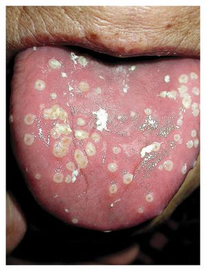 a) Herpetic glossitis b) Aphthous ulceration c) Pemphigoid d) Scurvy e) Oral candidiasis source: nejm.org