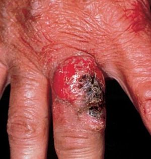 A 62-year-old man presents with an ulcerated, encrusted, and infiltrating lesion on the sun-exposed dorsal aspect of a finger (shown in the image). A biopsy reveals squamous cell carcinoma. The metastatic potential of this neoplasm would be enhanced by upregulation of the gene for which of the following proteins?