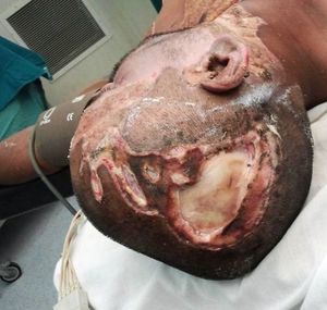 This young patient came too close to a high tension wire while working as an electrician which resulted in full thickness contact burns over his scalp leading to full thickness scalp loss,