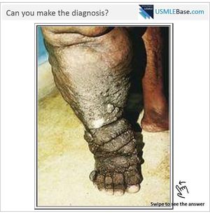 A 40 year old man has had progressive enlargement of the left leg for the past 6 years, leading to the appearance shown in the figure. On physical examination he is afebrile. He has inguinal lymphadenopathy and scrotal edema. Infection with which of the following organisms is most likely the cause? 1. Schistosoma mansoni 2. Echinococcus granulosus 3. Trichinella spiralis 4. Leishmania tropica 5. Wuchereria bancrofti