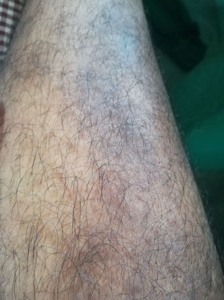 It has been there for two years,no pain anterior part of leg is dark and elbow too