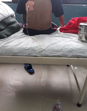seems like they are tapping the patien's pleural fluid with a chest tube. the pleural effusion can be due to autoimmune events in MDS patients (however it's very rare). also the pleural effusion can be due to an infection, since MDS patients has neutropenia.