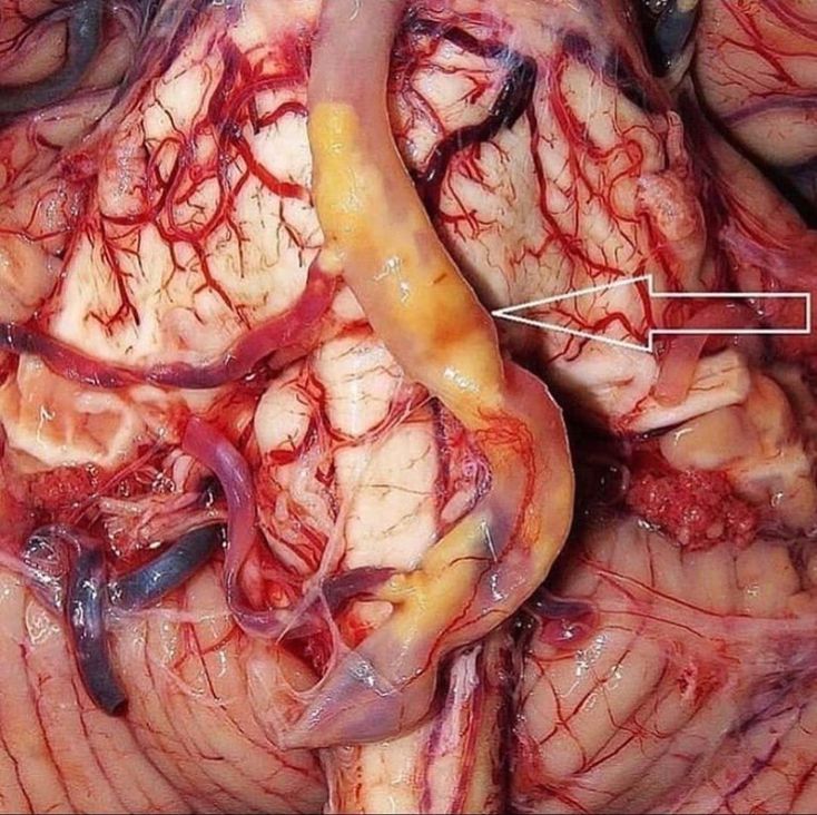 Shown in this image is the vasculature of the brainstem, and the deeper structures, most notably the medulla can be seen at the back of the image. One important brainstem artery is the basilar artery (pictured with the arrow) and a stroke in this region can lead to "Locked in syndrome" which is characterized by paralysis of all muscles besides those for blinking with full sensation. In this image the basilar artery is yellow which is likely due to atherosclerosis. Atherosclerosis of the basilar artery is rare, as other arteries, namely the abdominal aorta and coronary vessels, are often affected first. Over time these atherosclerotic plaques get bigger and bigger, before they can burst, forming a thrombus. If a thrombus occludes an entire vessel, cells downstream of the thrombus can die, causing a heart attack or stroke. One major mediator of arteriosclerosis is your LDL cholesterol and blood glucose levels. In outpatient setting a "Lipid panel" and "fasting blood glucose/ hemoglobin A1C" are commonly performed to check your cholesterol and blood sugar levels, respectively to prevent complications such as this! 🔸 Comment below as to some health tips you can leave others to help them manage their cholesterol and blood sugar! #surgery #brain #brainhealth #anatomy #medicine #health #healthyliving #medical #medicogram